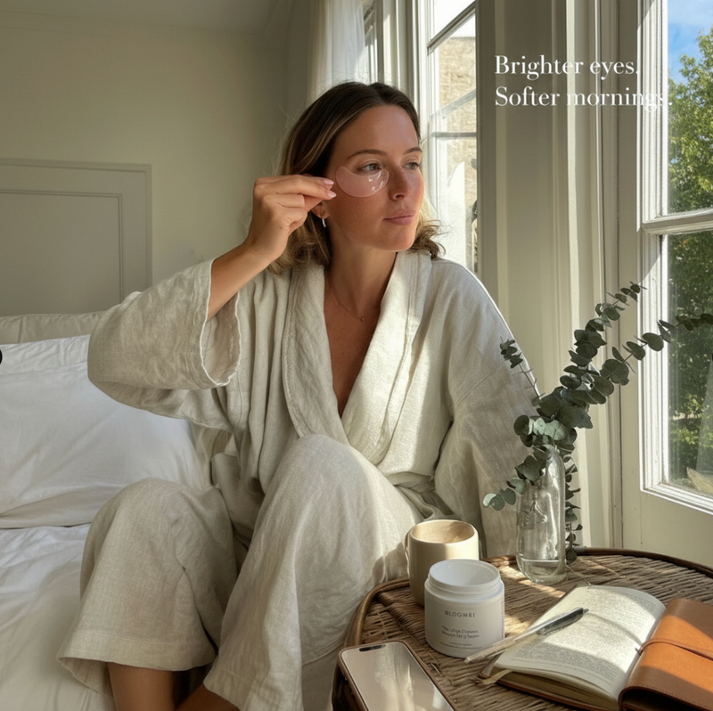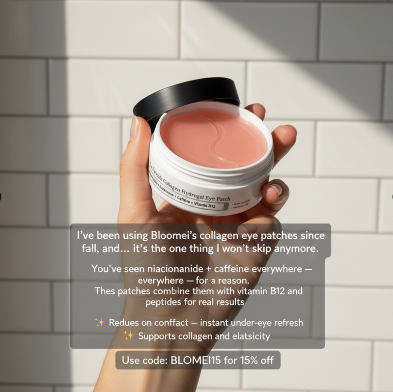 Los Parches de Péptidos de Colágeno de Bloomei son mascarillas de hidrogel para ojos de inspiración clínica, enriquecidas con péptidos de colágeno, cafeína, adenosina y niacinamida , los mismos ingredientes de confianza en la dermatología coreana. Nuestro exclusivo hidrogel de fijación fija no se desliza, sino que fija estos activos contra la piel para que se absorban profundamente en lugar de evaporarse como las cremas.